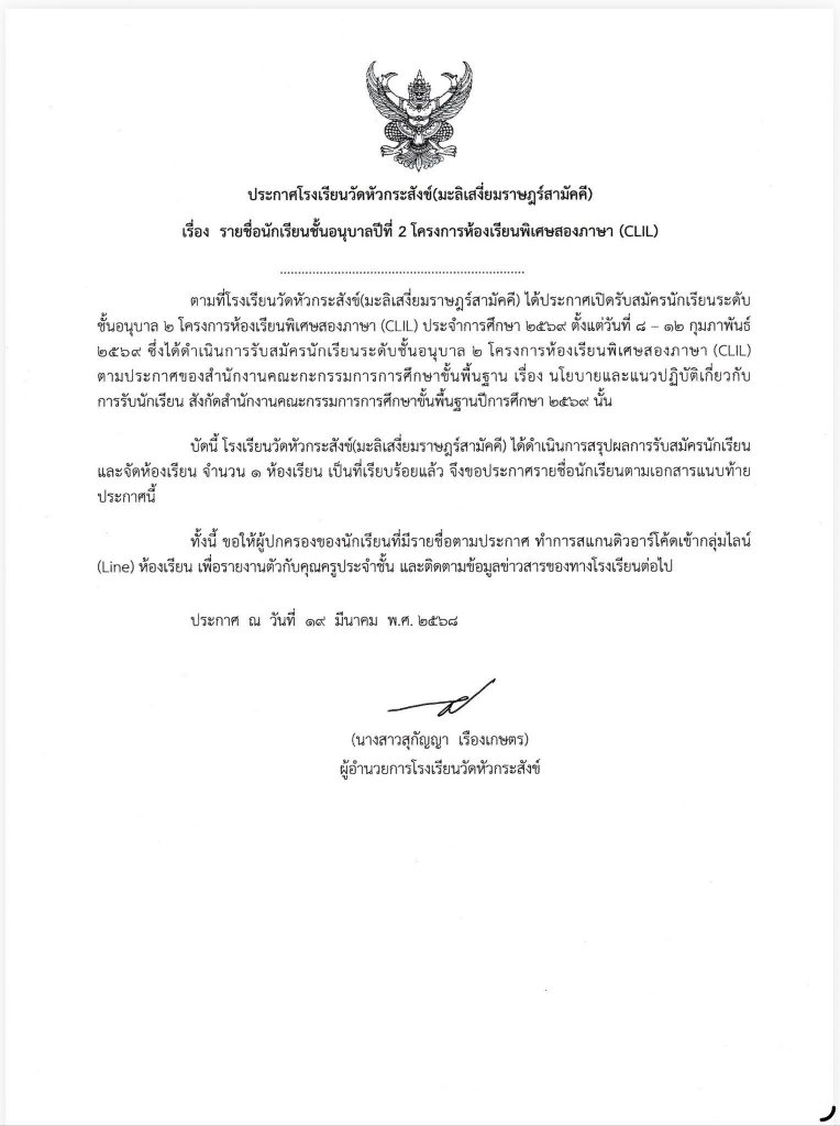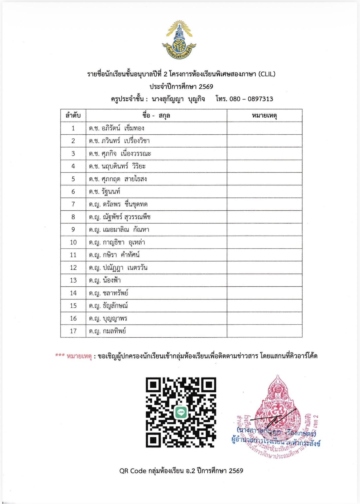 ประกาศรายชื่อนักเรียนชั้นอนุบาลปีที่ 2 โครงการห้องเรียนพิเศษสองภาษา โรงเรียนวัดหัวกระสังข์ ประจำปีการศึกษา 2569