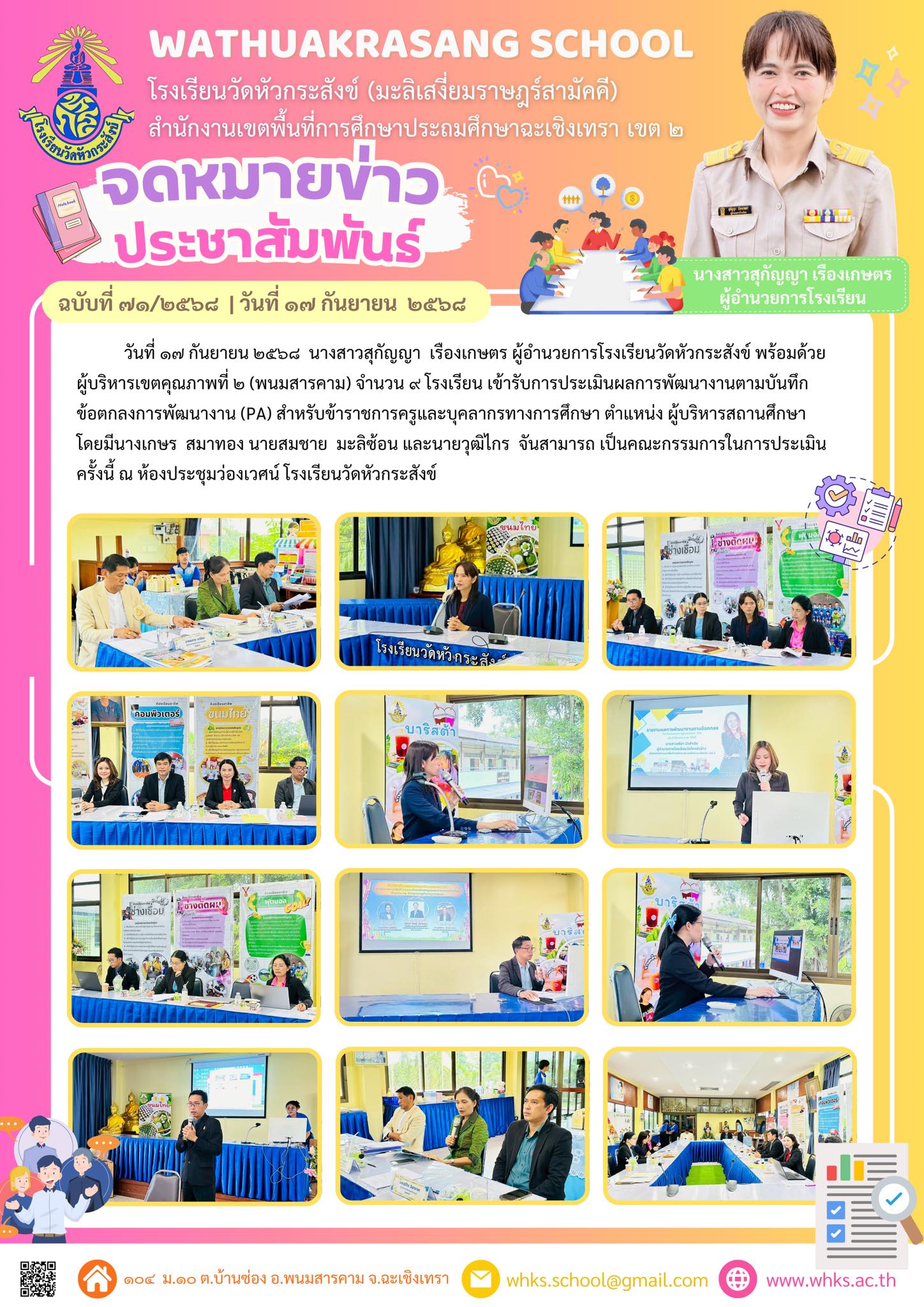 วันที่ ๑๗ กันยายน ๒๕๖๘ นางสาวสุกัญญา เรืองเกษตร ผู้อำนวยการโรงเรียนวัดหัวกระสังข์ พร้อมด้วยผู้บริหารเขตคุณภาพที่ ๒ (พนมสารคาม) จำนวน ๙ โรงเรียน เข้ารับการประเมินผลการพัฒนางานตามบันทึกข้อตกลงการพัฒนางาน (PA) สำหรับข้าราชการครูและบุคลากรทางการศึกษา ตำแหน่ง ผู้บริหารสถานศึกษา โดยมีนางเกษร สมาทอง นายสมชาย มะลิซ้อน และนายวุฒิไกร จันสามารถ เป็นคณะกรรมการในการประเมินครั้งนี้ ณ ห้องประชุมว่องเวศน์ โรงเรียนวัดหัวกระสังข์